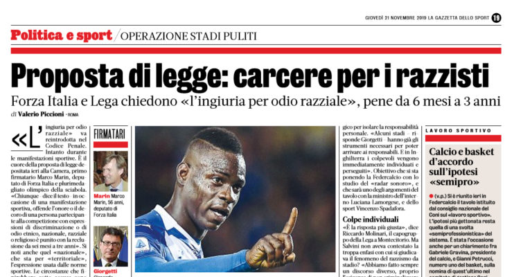 Gazzetta dello Sport: “Proposta di legge: carcere per i razzisti. Forza Italia e Lega chiedono: «L’ingiuria per odio razziale», pene da 6 mesi a 3 anni”