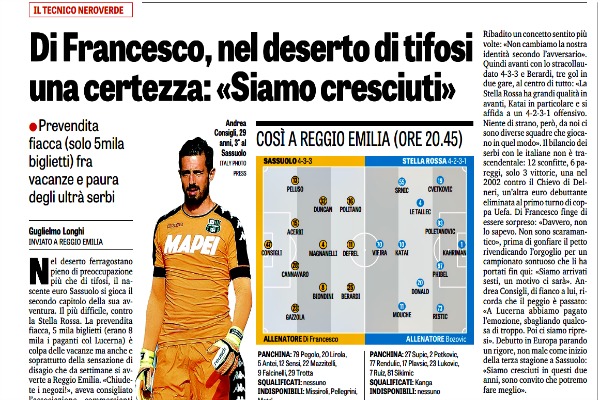 Gazzetta dello Sport, prossimo avversario: “Europa League Di Francesco, nel deserto di tifosi una certezza: «Siamo cresciuti». Prevendita fiacca (solo 5mila biglietti) fra vacanze e paura degli ultrà serbi”