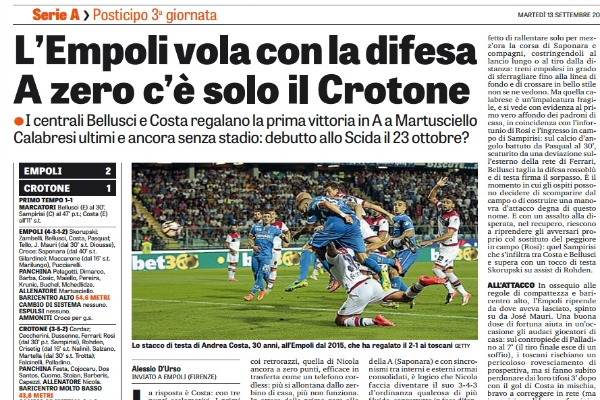 “La risposta è Costa: con tre punti esclamativi. I primi della stagione. La domanda della vigilia era: «Chi riuscirà tra Empoli e Crotone a schiodarsi dall’ultimo posto in classifica dopo due sconfitte di fila?». È il gol del difensore centrale (contestato dagli ospiti) a descrivere un verdetto certo. La squadra di Martusciello avanti coi retrorazzi, quella di Nicola ancora a zero punti, efficace in trasferta come un telefono cordless: più si allontana dallo zerbino di casa, più non funziona. In attesa della prima gara allo Scida (chiuso per lavori), prevista col Napoli il 23 ottobre, i calabresi dovranno inventarsi presto qualcosa per non sprofondare. BOTTA E RISPOSTA Contro l’Empoli disposto da anni allo stesso modo, con l’unico regista della A (Saponara) e con sincronismi tra interni e esterni ormai consolidati, è logico che Nicola faccia diventare il suo 3-4-3 d’ordinanza qualcosa di più fluido, soprattutto in fase difensiva: dispone i centrocampisti nella zona partenze del centrocampo di Martusciello, nel tentativo (a volte riuscito) di togliere dalla stanza dei bottoni Josè Mauri, Tello e Croce. Una scelta lucida, quella di formare due barrieroni nei momenti di massima difficoltà, che ha l’effetto di rallentare solo per mezz’ora la corsa di Saponara e compagni, costringendoli al lancio lungo o al tiro dalla distanza: treni empolesi in grado di sferragliare fino alla linea di fondo e di crossare in bello stile non se ne vedono. Ma quella calabrese è un’impalcatura fragile, e si vede con evidenza al primo vero affondo dei padroni di casa, in coincidenza con l’infortunio di Rosi e l’ingresso in campo di Sampirisi: sul calcio d’angolo battuto da Pasqual al 30’, scaturito da una deviazione sull’esterno della rete di Ferrari, Bellusci taglia la difesa rossoblù e di testa firma il sorpasso. È il momento in cui gli ospiti possono decidere di scomparire dal campo o di costruire una manovra d’attacco degna di questo nome. E con un assalto alla disperata, nel recupero, riescono a riprendere gli avversari proprio col sostituto del peggiore in campo (Rosi): quel Sampirisi che s’infiltra tra Costa e Bellusci e supera con un tocco di testa Skorupski su assist di Rohden. ALL’ATTACCO In ossequio alle regole di compattezza e baricentro alto, l’Empoli riprende da dove aveva lasciato, spinto su da José Mauri. Una buona dose di fortuna aiuta in un’occasione gli audaci giocatori di casa: sul contropiede di Palladino al 7’ (il tiro finale esce di un soffio), i toscani rischiano un pericoloso rovesciamento di prospettiva, ma si fanno subito perdonare dai loro tifosi 3’ dopo con il gol di Costa in mischia, bravo a correggere in rete (ma in posizione di leggero fuorigioco) lo spiovente del solito Pasqual. È la svolta decisiva, e null’altro succederà a parte il rosso a Dussenne che soffoca ogni tentativo di riemersione calabrese: dopo la grande paura, i padroni di casa trovano una luce fortissima in fondo al tunnel”. Questo quanto si legge su “La Gazzetta dello Sport”.