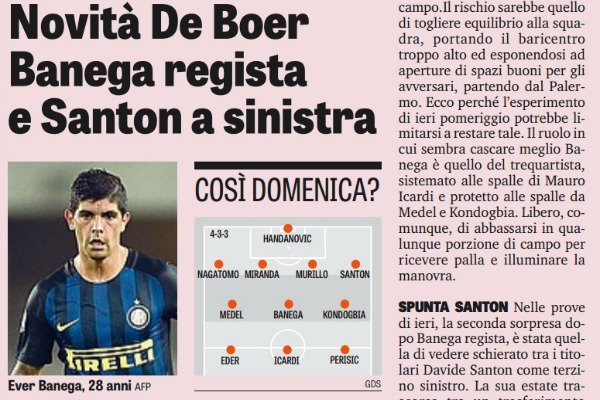 Gazzetta dello Sport, prossimo avversario: “Novità De Boer: Banega regista e Santon a sinistra, ecco la formazione anti-Palermo”