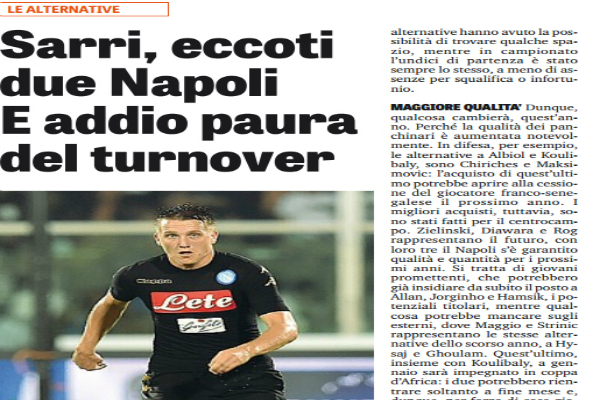 MAGGIORE QUALITA’ Dunque, qualcosa cambierà, quest’anno. Perché la qualità dei panchinari è aumentata notevolmente. In difesa, per esempio, le alternative a Albiol e Koulibaly, sono Chiriches e Maksimovic: l’acquisto di quest’ultimo potrebbe aprire alla cessione del giocatore francosenegalese il prossimo anno. I migliori acquisti, tuttavia, sono stati fatti per il centrocampo. Zielinski, Diawara e Rog rappresentano il futuro, con loro tre il Napoli s’è garantito qualità e quantità per i prossimi anni. Si tratta di giovani promettenti, che potrebbero già insidiare da subito il posto a Allan, Jorginho e Hamsik, i potenziali titolari, mentre qualcosa potrebbe mancare sugli esterni, dove Maggio e Strinic rappresentano le stesse alternative dello scorso anno, a Hysaj e Ghoulam. Quest’ultimo, insieme con Koulibaly, a gennaio sarà impegnato in coppa d’Africa: i due potrebbero rientrare soltanto a fine mese e, dunque, per forza di cose giocheranno Maggio e Strinic.