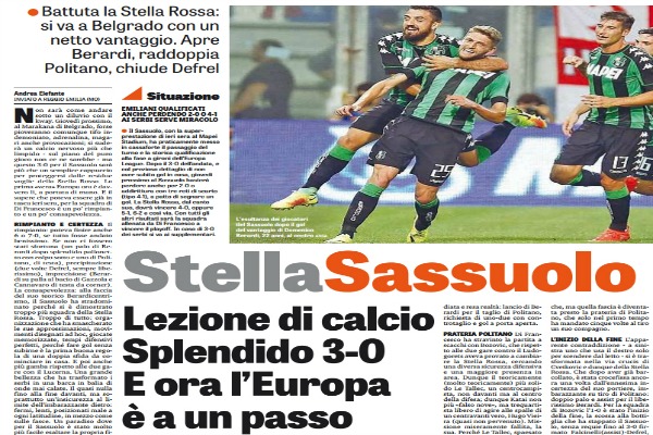 Gazzetta dello Sport, prossimo avversario: “Stella Sassuolo, lezione di calcio: splendido 3-0 e ora l’Europa è a un passo”