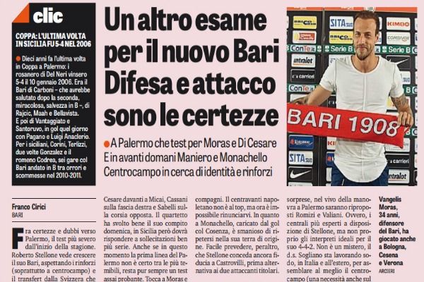 Gazzetta dello Sport, prossimo avversario: “Un altro esame per il nuovo Bari, difesa e attacco sono le certezze. A Palermo che test per Moras e Di Cesare. E in avanti domani Maniero e Monachello, centrocampo in cerca di identità e rinforzi”