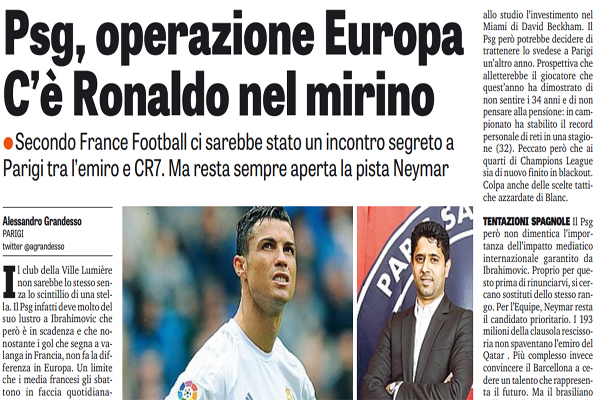 Gazzetta dello Sport: “Psg, operazione Europa: c’è Ronaldo nel mirino. Incontro segreto a Parigi tra l’emiro e CR7. Ma resta sempre aperta la pista Neymar”