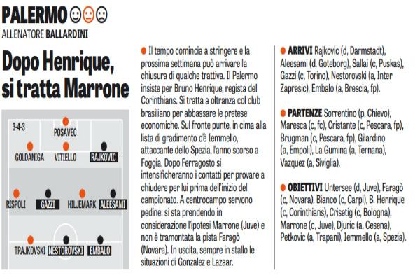“Il tempo comincia a stringere e la prossima settimana può arrivare la chiusura di qualche trattiva. Il Palermo insiste per Bruno Henrique, regista del Corinthians. Si tratta a oltranza col club brasiliano per abbassare le pretese economiche. Sul fronte punte, in cima alla lista di gradimento c’è Iemmello, attaccante dello Spezia, l’anno scorso a Foggia. Dopo Ferragosto si intensificheranno i contatti per provare a chiudere per lui prima dell’inizio del campionato. A centrocampo servono pedine: si sta prendendo in considerazione l’ipotesi Marrone (Juve) e non è tramontata la pista Faragò (Novara). In uscita, sempre in stallo le situazioni di Gonzalez e Lazaar. ARRIVI Rajkovic (d, Darmstadt), Aleesami (d, Goteborg), Sallai (c, Puskas), Gazzi (c, Torino), Nestorovski (a, Inter Zapresic), Embalo (a, Brescia, fp). PARTENZE Sorrentino (p, Chievo), Maresca (c, fc), Cristante (c, Pescara, fp), Brugman (c, Pescara, fp), Gilardino (a, Empoli), La Gumina (a, Ternana), Vazquez (a, Siviglia). OBIETTIVI Untersee (d, Juve), Faragò (c, Novara), Bianco (c, Carpi), B. Henrique (c, Corinthians), Crisetig (c, Bologna), Marrone (c, Juve), Djuric (a, Cesena), Petkovic (a, Trapani), Iemmello (a, Spezia)”. Questo quanto si legge sull’edizione odierna de “La Gazzetta dello Sport”.