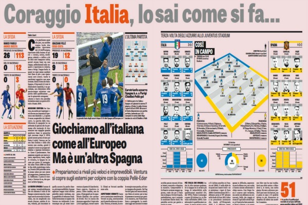 Gazzetta dello Sport: “Qualificazioni Mondiali: stasera Italia-Spagna. Coraggio Italia, lo sai come si fa…”