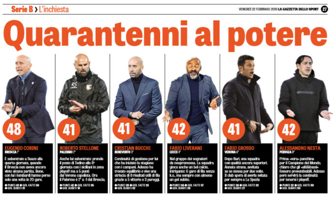 A capo di questa comitiva sta Eugenio Corini.  Ha sfondato ogni pregiudizio nel giro di pochissime settimane, godendo dei servigi di Donnarumma che a sua volta lo ringrazia per avergli costruito alle spalle un’impalcatura solida e intelligente. I primi 4 posti della B sono poi completati da altri quarantenni arrembanti. A Palermo c’è Roberto Stellone. In campo segnava, in panchina è diventato un gestore di tattica, uomini ed emozioni. Nel capoluogo siciliano è difficile tenere lontani gli affari societari da diagonali, marcature preventive e raddoppi. Eppure lui ci sta riuscendo, dopo un avvio del 2019 da mal di testa.
