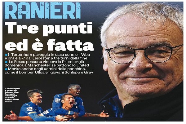 Gazzetta dello Sport: “Ranieri, tre punti ed è fatta. Leicester gran riserva, con la panca va in fuga