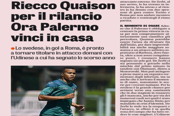 Gazzetta dello Sport: “Riecco Quaison per il rilancio. Ora Palermo vinci in casa. Lo svedese, in gol a Roma, è pronto a tornare titolare in attacco contro l’Udinese…”