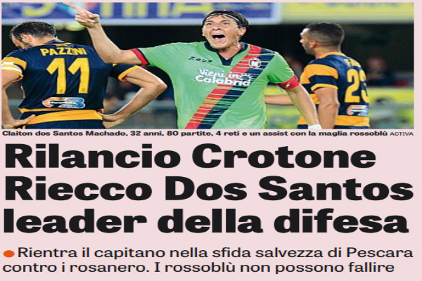 Gazzetta dello Sport: “Rilancio Crotone: riecco Dos Santos, leader della difesa. Rientra il capitano nella sfida salvezza di Pescara contro i rosanero. I rossoblù non possono fallire”