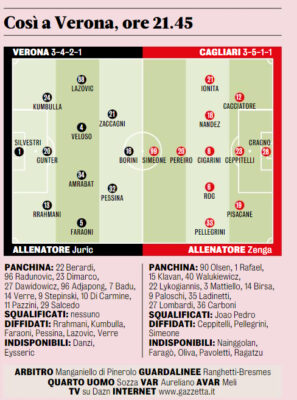 L’edizione odierna della “Gazzetta dello Sport” si sofferma sulle probabili formazioni di Verona-Cagliari. In foto, i ventidue che scenderanno in campo secondo il quotidiano.