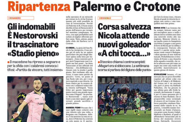 “Risalire? Forse si può. A patto che Ilija Nestorovski continui a segnare. Perché in un Palermo gestito come un ottovolante, l’otto la fa da padrone in tutti sensi. Come gli 8 gol del macedone, tornato a fare centro contro il Napoli, guada caso dopo 8 giornate di astinenza. Ha segnato quasi la metà delle reti dei rosanero fermi a 18, il secondo peggiore attacco del campionato. E adesso che Quaison, l’unico a tenere una media decente sotto porta (4 centri) è in uscita, se non ci pensa Nestorosvki le speranze di andare in rete sono ridotte al lumicino. Anche perché Zamparini non pare intenzionato a compare attaccanti e l’ultimo giorno di mercato purtroppo potrebbe confermarlo, secondo la logica perversa della plusvalenza a tutti i costi, del macedone e di Balogh che, secondo il patron, potrebbero venire offuscati dall’arrivo di un’altra punta. E allora tutti aggrappati a Ilija,nella speranza di un miracolo per restare in A e di far fruttare quanto più soldi possibile in caso di retrocessione. Perché col Palermo in B, il buon senso direbbe di fare di Nestorovski il perno dell’attacco per tornare nel massimo campionato. Invece, con ogni probabilità sarà ceduto al miglior offerente per fare cassa. Tutto, adesso, passa dalla sfida del Barbera col il Crotone. CI CREDO… La gioia del San Paolo lo ha rinvigorito, il suo primo gol di testa ha un sapore particolare che può dargli ulteriore spinta nella lotta per riemergere. «Sono contento per il gol, però l’importante non è segnare ma fare punti – ha detto l’attaccante al sito ufficiale del Palermo – . Ora dobbiamo continuare così, la strada è quella giusta. Noi crediamo alla salvezza, ci sono tante partite da giocare». Certo, un punto al San Paolo vale oro, per i rosanero equivale a una vittoria. Un buon viatico per lo scontro diretto con i calabresi reduci dalla vittoria sull’Empoli. “Sono felice per questo importante punto contro una grande squadra come il Napoli – ha precisato Nestorovski –, siamo stati bravi a non dare spazio agli avversari: grande sacrificio e grande punto». BARBERA PIENO Peccato che i suoi sigilli siano coincisi con una vittoria solo una volta, a Bergamo con l’Atalanta. Adesso c’è da invertire la rotta in casa, dove il Palermo ha centrato un solo punto in 11 partite. «Possiamo fare un grande passo avanti vincendo col Crotone – ha concluso il macedone –. Ci prepareremo bene per la sfida di domenica, che è troppo importante. Contro il Crotone voglio il Barbera pieno, perché il supporto dei tifosi ci aiuta a vincere le partite». Gufatemi ancora gli attaccanti, così si scatenano di nuovo come contro l’Empoli». Ci scherza su, Davide Nicola, dopo la larga vittoria di domenica scorsa, che ha portato serenità, un pizzico di convinzione e che ha riacceso le speranze di salvezza del Crotone. In effetti, gli attaccanti non andavano a rete in azione manovrata dal 4 dicembre scorso. Da allora, solo difensori e un rigore di Palladino contro il Pescara. Domenica, apriti cielo! Riecco Stoian (dopo l’inutile gol a Cagliari) e l’unduetre di Diego Falcinelli, che affianca nella speciale classifica dei «triplettisti» Belotti, Kalinic e Mertens (anche se il napoletano, nel match contro il Torino al San Paolo, ha messo a segno pure un poker). Ma c’è ancora un reparto tra i rossoblù che manca dalla gioia del gol ed è quello dei centrocampisti. «Bene, ora gufatemi quelli e chissà che non succeda anche per loro la stessa cosa», rincara Nicola al quale la vittoria ha regalato una carica e una tranquillità mai viste prima. NUOVA VITA È un Crotone che ha sempre faticato tanto per poi raccogliere poco o nulla e adesso invece sembra aver dato una notevole svolta alla sua stagione. Mancate vittorie come quella contro la Sampdoria (ricordate il pugno a una porta di ferro di Nicola per la rabbia e la conseguente frattura alla mano?) o partite perse malamente come contro il Bologna, i tifosi sperano di non vederne mai più. Probabilmente ci ritroviamo di fronte a una rinascita della squadra rossoblù, che vede la salvezza non più come un sogno ma come una realtà che potrebbe materializzarsi in questo girone di ritorno. RIVOLUZIONE Intanto, c’è un mercato che tra poco dovrebbe regalare gli ultimi colpi con l’arrivo di Gakpè e di Ninkovic dal Genoa ma è un mercato che però si porta via Raffaele Palladino, che ha giocato la sua ultima gara allo Scida lasciando decisamente il segno. E poi c’è tanta speranza per il ritorno di Ante Budimir, che si proporrebbe come terminale di attacco di un Crotone che a breve potrebbe cambiare fisionomia dalla cintola in su. In pratica, i rossoblù stanno ricostruendo un fronte d’attacco, con gente come Acosty, Gakpè, Ninkovic e Budimir, al quale si affiancherà l’attaccante più in forma del momento ovvero Diego Falcinelli. Occorrerà qualità, visto che la partenza di Palladino lascerà un vuoto difficilmente colmabile, anche se si fa molto affidamento in Adrian Stoian che appare in un momento di grazia. Adesso, però, guai a distrarsi: ci sono in palio punti pesanti nella gara di Palermo.”. Questo quanto riportato da “La Gazzetta dello Sport”.