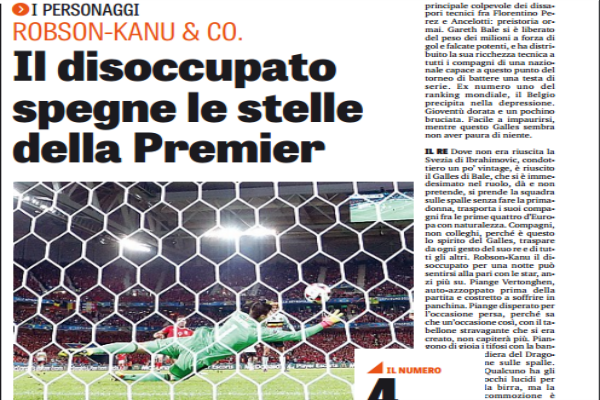 IL RE “Dove non era riuscita la Svezia di Ibrahimovic, condottiero un po’ vintage, è riuscito il Galles di Bale, che si è immedesimato nel ruolo, dà e non pretende, si prende la squadra sulle spalle senza fare la primadonna, trasporta i suoi compagni fra le prime quattro d’Europa con naturalezza. Compagni, non colleghi, perché è questo lo spirito del Galles, traspare da ogni gesto del suo re e di tutti gli altri. Robson­-Kanu il disoccupato per una notte può sentirsi alla pari con le star, anzi più su. Piange Vertonghen, auto­azzoppato prima della partita e costretto a soffrire in panchina. Piange disperato per l’occasione persa, perché sa che un’occasione così, con il tabellone stravagante che si era creato, non capiterà più. Piangono di gioia i tifosi con la bandiera del Dragone sulle spalle. Qualcuno ha gli occhi lucidi per la birra, ma la commozione è sincera. Il Galles riesce nell’impresa che non è riuscita alle orgogliose irlandesi e ci riesce perché ha un fuoriclasse equilibrato che sembra non patire mai la tensione, gioca a golf con i compagni, parla con i giornalisti tutti i giorni e tranquillizza gli altri quando l’altezza dell’ostacolo fa spavento. Non ha presidenti che vanno in curva con i tifosi, il Galles, e avendo un certo passato, anche se lontano, non si è attirato battute ironiche sui social. Solo rispetto, che non è più sorpresa. La cooperativa dei normali va avanti e le stelle stanno a guardare”. Questo ciò che si legge sull’edizione odierna de “La Gazzetta dello Sport”.