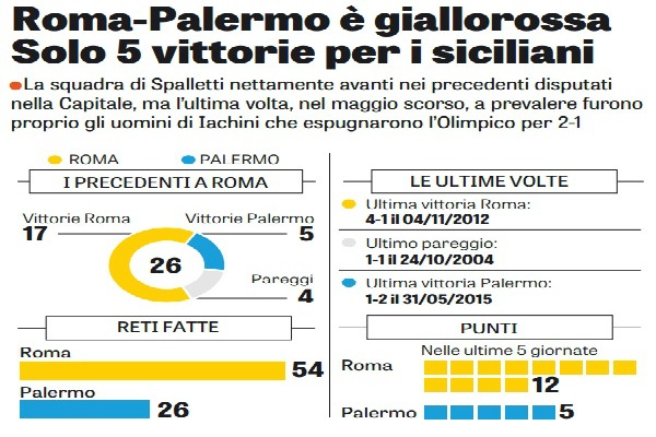 Come scrive l’edizione odierna de “La Gazzetta dello Sport” la squadra di Spalletti nettamente avanti nei precedenti disputati nella Capitale, ma l’ultima volta, nel maggio scorso, a prevalere furono proprio gli uomini di Iachini che espugnarono l’Olimpico per 2-1. Il Palermo nella sua storia in terra romana ha vinto solo 5 volte, contro i 17 successi della Roma. In alto un’illustrazione grafica.