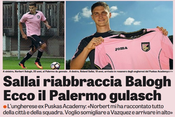 Gazzetta dello Sport: “Sallai riabbraccia Balogh. Ecco il Palermo gulasch. L’ungherese ex Puskas Academy: «Norbert mi ha raccontato tutto della città e della squadra. Voglio somigliare a Vazquez e arrivare in alto»”