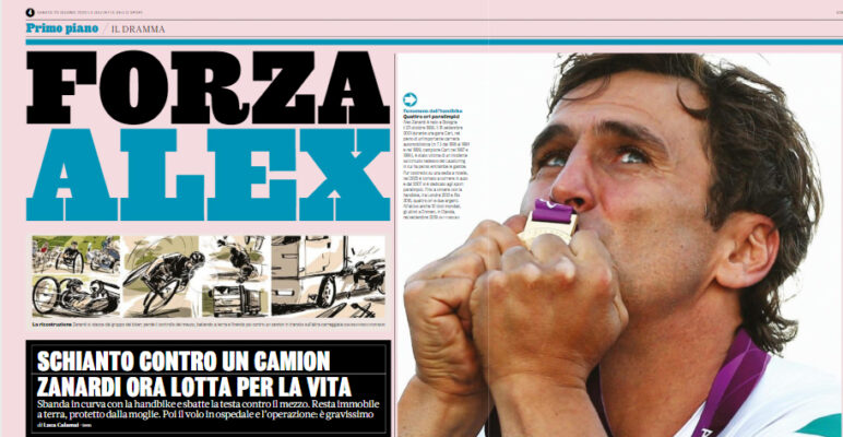 L’edizione odierna della “Gazzetta dello Sport” si sofferma sul tragico incidente che ha coinvolto Alex Zanardi. La sua handbike, nel momento in cui è iniziata una leggera discesa, ha sbandato di colpo. Ribaltandosi. Zanardi è caduto picchiando violentemente la testa, colpendo una parte di autoarticolato che stava salendo a bassa velocità. Zanardi è stato intubato dai medici che erano a bordo dell’elicottero.