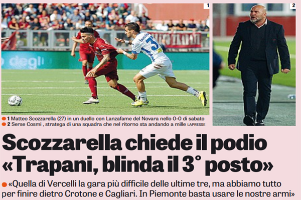 “A tre giornate dal termine della stagione regolare al Trapani mancano 3 punti per acquisire la certezzadi partecipare ai playoff (diventerebbe irraggiungibile per il Novara, nono, che di punti ne ha 59) mentre ne occorrono di più per mantenere il terzo posto in classifica. Calcoli improponibili ad inizio di girone di ritorno quando ci si chiedeva se il Trapani ce l’avrebbe fatta a conquistare quei 21 punti che mancavano per raggiungere la quotasalvezza (50 punti). La squadra granata invece è andata molto oltre le aspettative, di punti ne ha già conquistati 37 (seguono Spezia con 36, Crotone e Virtus Entella con 33), ha ridotto da 17 a 8 i punti di distacco dal Cagliari che era primo in classifica e, cosa ancora più importante, è risalito dal decimo al terzo posto: «I playoff sono dietro l’angolo – dice il centrocampista granata Matteo Scozzarella – ma è importante pure come ci si arriva. Anche se con un pizzico di rammarico per non aver vinto contro il Novara, cosa che ci avrebbe fatto allungare su Bari e Pescara, siamo comunque contenti di aver mantenuto il terzo posto in classifica». LOTTA ALLE INSEGUITRICI Una posizione di privilegio oltre che di prestigio quest’ultima (consentirebbe di saltare i preliminari dei playoff) che il Trapani vuol difendere dall’attacco degli squadroni che l’inseguono, primi fra tutti Pescara e Bari, in classifica appena un punto sotto al Trapani che di punti ne ha 66, e delle altre già dentro la grigliaplayoff come Spezia (62 punti), Cesena e Virtus Entella (61 punti). Pescara e Bari, fra l’altro, in quest’ultimo periodo stanno viaggiando a ritmi molto sostenuti: la squadra abruzzese è in serie positiva da 6 gare (5 vittorie e 1 pari), addirittura da 9 giornate (6 vittorie e 3 pari) quella pugliese. Per non essere agguantato il Trapani deve allungare la sua straordinaria serie positiva che dura da 13 giornate (10 vittorie e 3 pari). CALENDARIO Impossibile fare pronostici in questa fase decisiva della stagione dove invece è possibile qualsiasi risultato. Un certo ruolo, comunque, potrebbe averlo il calendario. Il Trapani è atteso da due trasferte (Pro Vercelli e Bari) e da una gara interna (Crotone) mentre alle inseguitrici più immediate (Pescara, Bari e Spezia) il calendario riserva una sola trasferta: «Per quanto ci riguarda si tratta di tre partite difficili – dice Scozzarella – ma quella di Vercelli penso sia la più importante delle tre, fondamentale per riuscire a bloccare il terzo posto. Se giochiamo alla nostra maniera possiamo farcela». Sarebbe auspicabile pertanto giungere a questo appuntamento nelle migliori condizioni psicofisiche, recuperando alla migliore forma alcuni giocatori che negli ultimi tempi hanno accusato degli acciacchi come Scozzarella, Coronado, Petkovic, Perticone e Citro. Tutti, comunque, dovrebbero essere disponibili per la trasferta di Vercelli, mentre qualche dubbio si nutre per Camigliano che sabato ha rimediato una forte contusione ad un ginocchio”. Questo quanto si legge sull’edizione odierna de “La Gazzetta dello Sport”.
