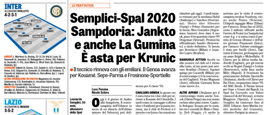Gazzetta dello Sport: “Semplici-Spal 2020 Sampdoria: Jankto e anche La Gumina – Tutte le trattative del giorno in serie A”