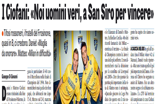 “Daniel e Matteo Ciofani erano tristissimi alla fine di FrosinonePalermo, la partita che ha mandato i ciociari virtualmente in B. Poi hanno dato uno sguardo al calendario e si sono ricordati che giocare contro il Milan a San Siro è il sogno di una vita. «Con quei colori è nata la passione per il calcio – dice il bomber Daniel —. È la prima squadra che ho visto. Van Basten è il primo giocatore che ho provato a imitare. Ma sono legato a una gara in particolare: il 40 contro il Barcellona nella finale di Champions del 1994. Non dimenticherò mai quello che fece papà, che abbracciò me dopo l’10, Matteo sul 20, mamma sul 30 e al 40 di Desailly ci abbracciammo tutti». Sì, perché la passione per il Milan nasce da lontano. Da nonno Giovanni, che da Cerchio (piccolo paese vicino ad Avezzano, in Abruzzo) emigrò in Venezuela dal 1953 al 1980. Papà Tonino si innamorò del Milan di Nils Liedholm a 6 anni, quando incontrò la squadra rossonera durante una tournée in Sudamerica e conobbe campioni come Trapattoni e Altafini. PASSIbONE Daniel e Matteo cominciarono a giocare a calcio nel cortile di nonno Giovanni, che era poliomielitico, ma non rinunciava mai ad allenare i nipoti. Daniel giocava con la maglia di Van Basten, Matteo con quella di Weah. «Adesso, però, la passione per i colori rossoneri è scemata – dice Matteo –. Da quando siamo in A papà Tonino segue solo noi». E oggi sarà a San Siro con la moglie Emilia e le fidanzate di Daniel e Matteo, Raffaella e Cecilia. «Ho dei ricordi fantastici del Milan – continua il terzino –. La finale di Champions contro la Juve è una delle più sofferte. E non dimenticherò mai la delusione per la sconfitta col Liverpool nel 2005». Dire che questa è la partita più importante della vita di Matteo non è un’utopia. «Quando giocavo in Lega Pro dissi che questo era il mio sogno nel cassetto. Spero di essere titolare. Possiamo anche vincere, perché questo Milan è in difficoltà. Forse alcuni di noi non giocheranno più a San Siro e dobbiamo onorare questa maglia fino alla fine». Gli fa eco Daniel, che crede ancora nell’impresa. «Dobbiamo rispettare i nostri tifosi che ci hanno sempre applaudito, anche dopo il k.o. col Palermo. Questa gente ha capito che siamo uomini veri». A CACCIA DEL BIS In gol all’andata (ma il Milan vinse 42 al Matusa), Daniel vuole ripetersi. «Ma non è stato quello il gol più importante dell’anno. A Verona col Chievo ho segnato su assist di Matteo. Era un altro nostro sogno e lo abbiamo realizzato». E a 270’ dal termine del campionato in casa Ciofani si cerca di non pensare a un ciclo che sta finendo, con l’addio quasi certo di Stellone. Purtroppo, però, a San Siro non ci sarà nonno Giovanni, scomparso nel 1999. «Mi dispiace molto – chiude Matteo –. Nonno era un grande tifoso, ma forse è meglio così. Se ci avesse visto contro il Milan, forse ci avrebbe rimesso le penne»”. Questo quanto si legge sull’edizione odierna de “La Gazzetta dello Sport”.