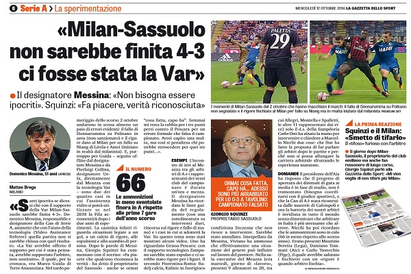 Gazzetta dello Sport, serie A: “La sperimentazione: «Milan-Sassuolo non sarebbe finita 4-3 se ci fosse stata la Var». Il designatore Messina: «Non bisogna essere ipocriti»”