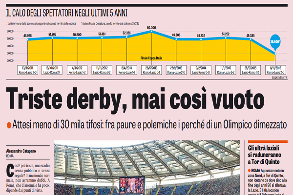 Gazzetta dello Sport: “Serie A, Lazio-Roma triste derby, mai così vuoto. Attesi meno di 30 mila tifosi: fra paure e polemiche i perché di un Olimpico dimezzato”