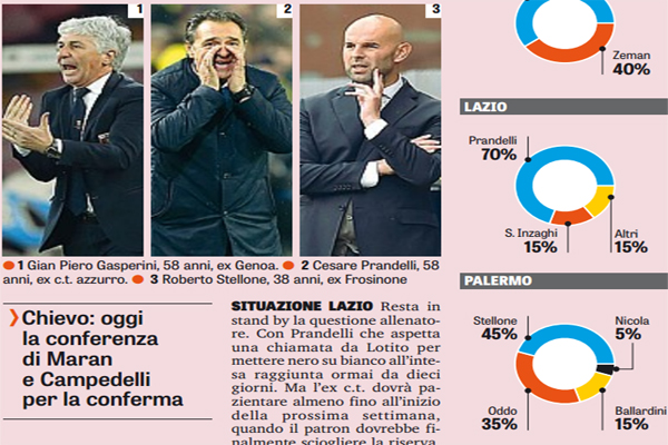 Gazzetta dello Sport: “Serie A, panchine calde: Atalanta su Gasp. Lazio, Prandelli aspetta Lotito. Palermo: in pole Stellone”