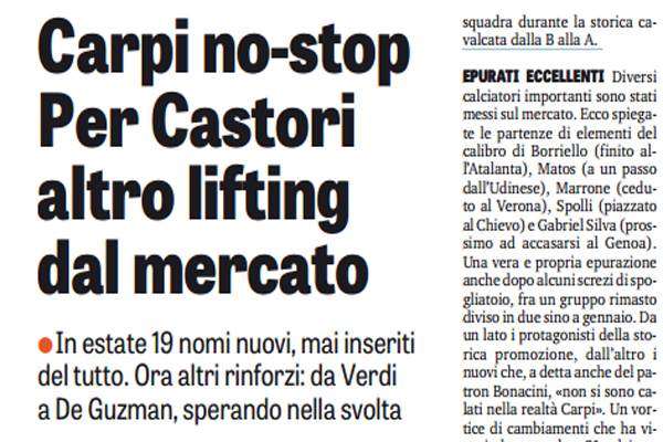 “Uno e trino. Il Carpi targato 2015/16 ha vissuto in tre dimensioni la stagione da matricola in Serie A. In estate, dopo l’addio del direttore sportivo Giuntoli volato al Napoli, la squadra ha cambiato pelle: 19 acquisti e una rivoluzione mai digerita dall’ambiente biancorosso. Pochi mesi dopo i cambiamenti operati da Sogliano, c’è stata la restaurazione operata dal patron Bonacini. A inizio novembre il golpe impostato dai senatori dello spogliatoio ha riportato al timone Castori (mandato via dopo sei giornate per far spazio a Sannino). Un ritorno al passato in tutti i sensi. Sul campo e in dirigenza. Il primo obiettivo del tecnico marchigiano, di concerto con il nuovo d.s. Romairone e la proprietà, è stato quello di ritrovare lo spirito garibaldino che aveva contraddistinto la squadra durante la storica cavalcata dalla B alla A. EPURATI ECCELLENTI Diversi calciatori importanti sono stati messi sul mercato. Ecco spiegate le partenze di elementi del calibro di Borriello (finito all’Atalanta), Matos (a un passo dall’Udinese), Marrone (ceduto al Verona), Spolli (piazzato al Chievo) e Gabriel Silva (prossimo ad accasarsi al Genoa). Una vera e propria epurazione anche dopo alcuni screzi di spogliatoio, fra un gruppo rimasto diviso in due sino a gennaio. Da un lato i protagonisti della storica promozione, dall’altro i nuovi che, a detta anche del patron Bonacini, «non si sono calati nella realtà Carpi». Un vortice di cambiamenti che ha visto indossare a ben 31 calciatori, in almeno una gara di campionato, la maglia della formazione emiliana. RITORNO AL FUTURO A gennaio la scelta è stata quella di tornare al passato. Con i suggerimenti di un consigliere illustre: l’ex d.s. Giuntoli che ha prodotto la sinergia di mercato con il Napoli (De Guzman e Gnahorè). Dieci, compreso Simone Verdi che firmerà oggi, i volti nuovi per rincorrere l’impresa salvezza. Cavalli di ritorno che già conoscevano l’ambiente carpigiano come i difensori Suagher e Poli, miscelati a elementi che la Serie A l’avevano solo assaggiata (Mancosu, Crimi e Sabelli). Fra i nuovi sono sopravvissuti solo Cofie e Belec. Con la vecchia guardia tornata così al centro del progetto. Pasciuti, Gagliolo, Romagnoli, Lollo e Mbakogu sono tornati a essere titolari fissi. Una rivoluzione gattopardesca per cercare di restare in A”. Questo è quanto si legge sull’edizione odierna de “La Gazzetta dello Sport”.