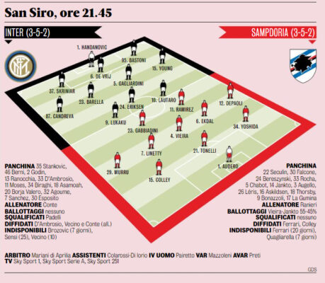 Gazzetta dello Sport: Serie A, stasera c’è Inter-Sampdoria. Le probabili formazioni