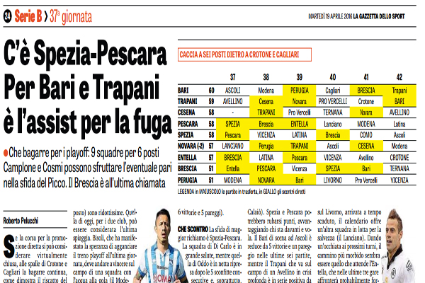 Gazzetta dello Sport: “Serie B, 37a giornata: c’è Spezia-Pescara. Per Bari e Trapani è l’assist per la fuga. Che bagarre per i playoff: 9 squadre per 6 posti”