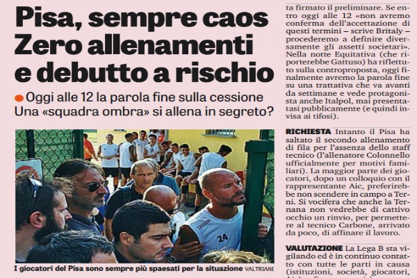 Gazzetta dello Sport, serie B: “Pisa, sempre caos: zero allenamenti e debutto a rischio. Oggi alle 12 la parola fine sulla cessione. Una «squadra ombra» si allena in segreto?”