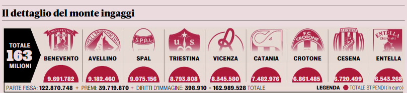 Il salto Cosa è cambiato? Di sicuro i club che scendono dalla B si portano dietro contratti molto pesanti, ma quelli ci sono ogni anno. Quelli di quest’anno sono riusciti a risparmiare meno, ma non solo. La stagione scorsa il club Paperone era il Crotone (pure reduce dalla B) con 7,5 milioni complessivi, oggi ne abbiamo tre sopra i 9 milioni: le retrocesse Benevento (primo) e Spal, più l’Avellino (secondo), che ha quasi raddoppiato nel giro di un anno.