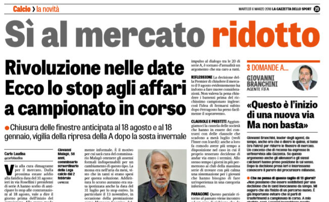 “Via alla cura dimagrante per il mercato. Dalla prossima estate addio alla fatidica data del 31 agosto: ieri in via Rosellini i presidenti di serie A hanno scelto di anticipare lo stop alle contrattazioni al 18 agosto, vale a dire il giorno prima dell’inizio del campionato. Allo stesso modo scompare la dead-line invernale del 31 gennaio: i trasferimenti saranno possibili, infatti, solo sino al 18, anche in questo caso vigilia della ripresa della serie A dopo la sosta invernale. TEMPI TECNICI Il pronunciamento di ieri sera in Lega è avvenuto in un contesto assolutamente informale. È il motivo per cui sarà cura del commissario Malagò ottenere gli assensi formali indispensabili per un cambiamento di questo tipo. La mossa era nell’aria da mesi, visto che in tanti si erano spesi per questa soluzione. Addirittura lo scorso autunno era stata ipotizzata anche la data del 31 luglio per lo stop estivo. In particolare il 13 novembre, in occasione della premiazione come Manager Sportivo dell’anno l’a.d. della Juve Beppe Marotta aveva indicato quella data a nome dell’associazione dei direttori sportivi italiani. RITARDI Poi la querelle politica sui temi della governance e dei diritti tv avevano fatto calare il silenzio su questo argomento. Ora che Malagò ha dato nuovo impulso al dialogo tra le 20 di serie A, è tornato d’attualità un argomento che sta caro a tutti. RIFLESSIONI La decisione della Premier di chiudere il mercato il 9 agosto evidentementeha indottoafarenuoveconsiderazioni.Nonvalevalapenachiudereibattenti prima del ricchissimo campionato inglese: così l’idea di fermarsi subito dopo Ferragosto ha preso facilmente il sopravvento. CLAUSOLE E PRESTITI Aggiungiamoci la cautela delle società che hanno in essere dei contratti con delle clausole che scadono a metà luglio (vedi l’Inter con Icardi): anche a loro fa comodo avere più tempo a disposizione nel caso in cui il proprio tesserato decidesse di andar via entro i termini. Allo stesso tempo i giorni in più permettono ai club della massima serie di trovare con più calma una sistemazione per i giovani che hanno bisogno di fare un’esperienza in una categoria inferiore. PARAGONI Questo parziale ritorno al passato viene incontro ad un coro di richieste che da tempo invoca una normalizzazione del mercato. Dal 1995 in poi il boom dei cambi di maglia ha prodotto delle evidenti esasperazioni. A cominciare dall’effetto bulimia. Questo passo indietro, in realtà, appare un progresso. Per ridare un volto umano anche al mercato”. Questo quanto riportato dall’edizione odierna de “La Gazzetta dello Sport”.