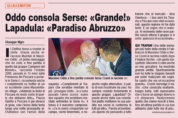 La sesta promozione in A del Pescara porta la firma di Massimo Oddo, il tecnico del futuro. Perché ha vinto con la squadra della sua città dopo aver eliminato in una durissima battaglia quella della terra di suo padre. Una finale ipotecata con il 20 dell’andata, ma sancita al ritorno con un sofferto pareggio, conquistato contro un Trapani uscito tra gli applausi del suo calorosissimo pubblico (record di paganti, ma erano ben più di 8.000 sugli spalti). Otto anni fa questa squadra era in Eccellenza: essere arrivati a questo punto è già un grandissimo risultato. […]. Il Delfino torna a riveder le stelle. Grazie anche all’ascesa Mundial di Massimo Oddo: «Il primo messaggio che ho visto a fine partita è quello dal gruppo Campioni del Mondo», racconta l’iridato 2006, passato in 13 mesi dalla Primavera del Pescara a portarlo in Serie A, riscuotendo anche i complimenti su twitter di un ex eccellente come Massimiliano Allegri. «Vedendo la festa di Pescara mi rendo conto di quello che abbiamo fatto». Piazza Salotto a Pescara è già ubriaca di gioia, solo l’inizio della festa lunga una notte proseguita all’Adriatico con l’arrivo della squadra. «Complimenti al Trapani che avrebbe meritato di più prosegue Oddo , io ci sono passato l’anno scorso: erano due squadre che avrebbero meritato entrambe la Serie A». Il futuro è il massimo campionato: «Ce lo siamo conquistato sul campo, vorrei tenermelo, e neanche voglio alternative. A patto di non ricostruire da zero: ho sempre creduto fortemente in questo gruppo. Lapadula? Dipende anche dalla sua volontà. Sul piatto mettiamo la sua perdita ma vorrei la conferma di tutti gli altri». Parola al bomber: «In questo sto pensando a tutto tranne che al mercato dice Gianluca : i due anni tra Teramo e Pescara sono stati eccezionali, questa regione mi ha dato tanto. È un sogno che si realizza. Al momento delle nove partite senza vittorie il gruppo si è unito: qualcosa di eccezionale».