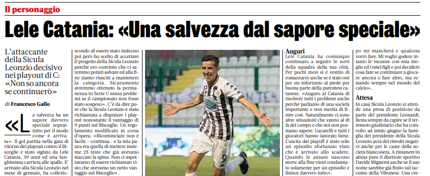 L’edizione odierna della “Gazzetta dello Sport” riporta le dichiarazioni di Lele Catania, calciatore della Sicula Leonzio: «La salvezza ha un