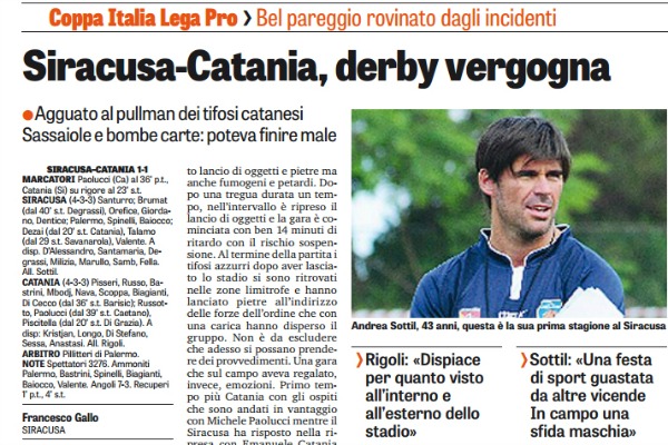 “Alla vigilia era una gara ad alto rischio per la forte rivalità tra le tifoserie che non si incontravano da ben 24 anni: purtroppo il calcio è stato messo in secondo piano con atti di violenza. Due tifosi del Catania colpiti dalle schegge di un vetro di un pullman andato in frantumi mentre uno steward in gradinata è stato trasportato in ospedale dopo lo scoppio di una bomba carta a pochi metri da lui. Un supporter del Catania ha accusato un malore ma poi si è ripreso. Un pomeriggio di sport macchiato dalle intemperanze di tifosi violenti. All’ingresso dei tifosi catanesi è iniziato un fitNizzetto suona la sveglia «Così non va, ma per la B tornerà il vero Trapani» 1Il centrocampista sul k.o. di Bologna «Serve coraggio, ascoltiamo Cosmi e miglioreremo» to lancio di oggetti e pietre ma anche fumogeni e petardi. Dopo una tregua durata un tempo, nell’intervallo è ripreso il lancio di oggetti e la gara è cominciata con ben 14 minuti di ritardo con il rischio sospensione. Al termine della partita i tifosi azzurri dopo aver lasciato lo stadio si sono ritrovati nelle zone limitrofe e hanno lanciato pietre all’indirizzo delle forze dell’ordine che con una carica hanno disperso il gruppo. Non è da escludere che adesso si possano prendere dei provvedimenti. Una gara che sul campo aveva regalato, invece, emozioni. Primo tempo più Catania con gli ospiti che sono andati in vantaggio con Michele Paolucci mentre il Siracusa ha risposto nella ripresa con Emanuele Catania che, entrato da appena tre minuti, è riuscito a trasformare un calcio di rigore concesso dal direttore di gara per un fallo di Russo tra le proteste della difesa ospite. Il Siracusa ha provato anche il gol del vantaggio ma la difesa catanese è riuscita a respingere. Condanna unanime a fine partita da parte dei due tecnici. «Dispiace per quello che è successo sugli spalti e anche fuori», ha detto l’allenatore del Catania Pino Rigoli. «Una festa di sport rovinata da questi incidenti – ha aggiunto Sottil l’allenatore del Siracusa – una sfida in campo maschia ma giocata a viso aperto»”. Questo quanto riportato dall’edizione odierna de “La Gazzetta dello Sport”.