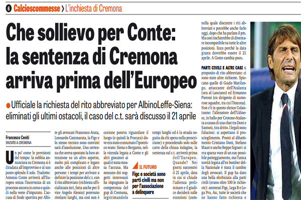 Gazzetta dello Sport: “Sollievo per Conte, la sentenza di Cremona arriva prima dell’Europeo. Il caso del c.t. sarà discusso il 21 aprile…”