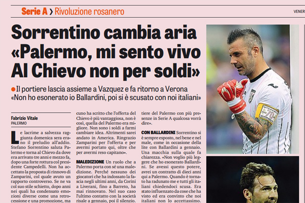 Gazzetta dello Sport: “Sorrentino cambia aria: «Palermo, mi sento vivo. Al Chievo non per soldi». Il portiere via insieme a Vazquez e torna a Verona «Non ho esonerato Ballardini, poi si è scusato con noi italiani»”