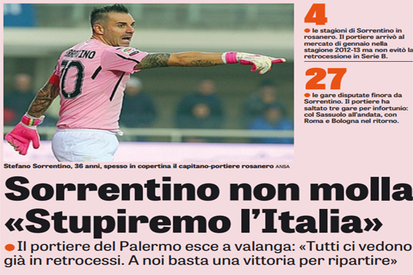 Gazzetta dello Sport: “Sorrentino non molla «Stupiremo l’Italia. Tutti ci vedono già in retrocessi. A noi basta una vittoria per ripartire»