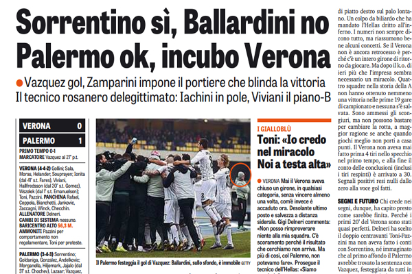 L’edizione odierna de “La Gazzetta dello Sport” si è così espressa in merito al momento poco chiaro che il Palermo sta attraversando: “Non doveva giocare. Scelta disciplinare, dopo la lite della vigilia col tecnico Ballardini. Ma una volta che si è trovato in campo con la fascia di capitano, Stefano Sorrentino ha optato per il ruolo di grande protagonista. L’impiego suo e di Gilardino lo ha deciso il presidente Zamparini con una telefonata a Ballardini, che di fatto ha delegittimato l’autorità del tecnico agli occhi della squadra, aprendo scenari per un nuovo ribaltone in panchina ancora prima del match. E Sorrentino s’è caricato, tirando fuori una delle più belle prestazioni della carriera, con due miracoli su Pazzini a inizio gara che avrebbero potuto riscrivere la storia di questa partita, e del futuro della squadra. Il Palermo ha sbancato Verona anche grazie a un guizzo da centravanti di Franco Vazquez, che ha ripulito un destro svirgolato di Jajalo stoppando il pallone – spalle alla porta – di esterno sinistro per poi in girata bucare Gollini di piatto destro sul palo lontano. Un colpo da biliardo che ha mandato l’Hellas dritto all’inferno. I numeri non sempre dicono tutto, ma riassumono bene alcuni concetti. Se il Verona non è ancora retrocesso è perché c’è un intero girone di ritorno da giocare. Ma dopo il k.o. di ieri più che l’impresa sembra necessario un miracolo. Quattro squadre nella storia della A non hanno ottenuto nemmeno una vittoria nelle prime 19 gare di campionato e nessuna s’è salvata. Sono ammessi gli scongiuri, ma non possono bastare per cambiare la rotta, a maggior ragione se anche quando giochi meglio non porti a casa punti. Il Verona non aveva mai fatto prima 4 tiri nello specchio nel primo tempo, e alla fine il conto delle conclusioni (inclusi i tiri respinti) è arrivato a 30. Segnali positivi resi nulli dallo zero alla voce gol fatti. SEGNI E FUTURO Chi crede nei segni, dunque, ha capito presto come sarebbe finita. Perché i primi 20’ del Verona sono stati quasi perfetti. Delneri ha scelto il doppio centravanti Toni-Pazzini ma non aveva fatto i conti con Sorrentino, né immaginato che al primo affondo il Palermo avrebbe trovato la sentenza con Vazquez, festeggiata da tutti in campo, magazzinieri compresi, a eccezione di Ballardini, rimasto impassibile davanti alla panchina come se la cosa non lo riguardasse. E forse è così: Zamparini si aspetta un passo indietro dal tecnico che ha già fatto sapere che non si dimetterà. Iachini chiede garanzie per tornare (rinforzi e nessuna interferenza da parte della società), in alternativa c’è Viviani, già nello staff rosanero ma senza esperienza in A. Ma questo conta poco: a Zamparini piace sempre stupire”.