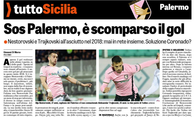 “La Gazzetta dello Sport” di oggi analizza la mancanza di gol segnati dal Palermo nelle ultime gare. “Appena 2 gol realizzati nelle ultime 3 partite, in 2 delle quali – Spezia ed Empoli in trasferta – i rosanero sono rimasti all’asciutto. E ancora zero gol per gli attaccanti in questo inizio 2018. Si è inceppato Nestorovski e il Palermo ne risente, ovvio, ma non è solo questo, il problema è… più lungo. Il macedone, infatti, non segna dalla fine di novembre, ma in realtà il suo digiuno dura da ben quattro giornate: l’ultima rete Nestorovski l’ha realizzata a fine novembre, poi un mese di stop per infortunio, il ritorno in campo contro la Salernitana nell’ultima dell’anno e la pausa post-natalizia. La sua media resta molto alta, ci mancherebbe: finora 10 gol in 16 partite giocate, bottino comunque di tutto rispetto.