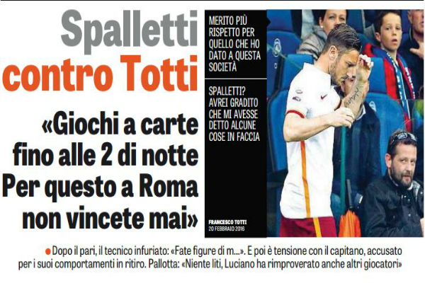 Gazzetta dello Sport: “Spalletti contro Totti: «Giochi a carte fino alle 2 di notte. Per questo a Roma non vincete mai»”