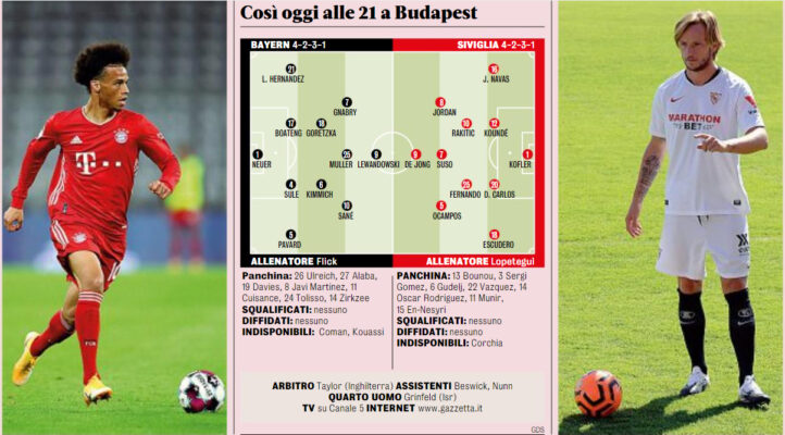 L’edizione odierna della “Gazzetta dello Sport” si sofferma sulla Supercoppa Europea fra Bayern Monaco e Siviglia, che si terrà questa sera a Budapest. In foto, le probabili formazioni del match.