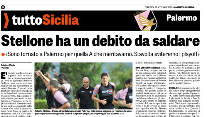 Gazzetta dello Sport: “Stellone ha un debito da saldare: «Stavolta eviteremo i playoff»”