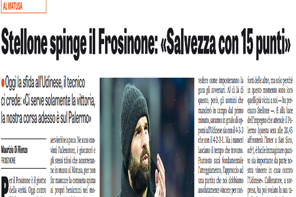 “Per il Frosinone è il giorno della verità. Oggi contro l’Udinese non può sbagliare. Fare bottino pieno è fondamentale in ottica salvezza. Con i tre punti in tasca, la rincorsa dei ciociari non sarebbe giunta al capolinea. Il pareggio, invece, per la squadra di Roberto Stellone avrebbe il sapore del brodino e probabilmente servirebbe a poco. Ne sono convinti l’allenatore, i giocatori e gli stessi tifosi che accorreranno in massa al Matusa, per non far mancare la consueta spinta ai propri beniamini nel momento topico del campionato. LA TABELLA L’Udinese dovrebbe schierarsi con il 433, ma non è detto che il Frosinone faccia altrettanto. Stellone in proposito ha chiarito: «Non ho ancora deciso come far giocare la squadra, aspettiamo prima di vedere come imposteranno la gara gli avversari. Al di là di questo, però, gli uomini che manderò in campo dal primo minuto, saranno in grado di opporsi all’Udinese sia con il 433 che con il 4231. Ma i numeri lasciano il tempo che trovano. Piuttosto sarà fondamentale l’atteggiamento, l’approccio ad una partita che noi dobbiamo assolutamente vincere per continuare ad avere concrete speranze di salvezza». Dopo averla fatta per qualche settimana sulla Sampdoria, adesso la corsa del Frosinone si è spostata sul Palermo che in classifica è quartultimo, a +4 sui ciociari: «Ora la nostra corsa è sui siciliani, non perché siano meno forti delle altre, ma solo perché in questo momento sono loro quelli più vicini a noi — ha precisato Stellone —. E alla luce dell’impegno che attende il Palermo (questa sera alle 20,45 affronterà l’Inter a San Siro, ndr), è facile immaginare quanto sia importante da parte nostra vincere in casa contro l’Udinese». L’allenatore, a sorpresa, ha poi svelato la sua tabella di marcia per la salvezza: «Con 4 vittorie e 3 pareggi potremmo essere salvi». Al momento il Frosinone ha 23 punti in classifica e, dunque, toccando quota 38, le speranze di rimanere in Serie A potrebbero diventare realtà”. Questo è quanto si legge sull’edizione odierna de “La Gazzetta dello Sport”.