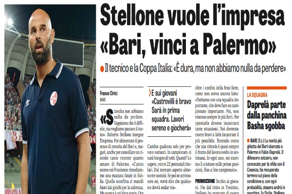 “«Stavolta non abbiamo nulla da perdere. Sappiamo che è difficile, ma vogliamo passare il turno». Roberto Stellone insegue l’impresa. Per alimentare il processo di crescita del Bari e, magari, anche per cancellare un ricordo tanto recente quanto amaro di Palermo. «L’anno scorso col Frosinone rimediammo una mazzata fatale in Sicilia. Quella sconfitta ci mandò fuori dai giochi per la salvezza. Ma questa è un’altra storia. Ora sono felice di guidare il Bari».
