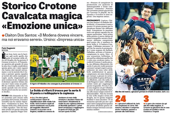 Gazzetta dello Sport: “Storico Crotone in serie A. Cavalcata magica: «Emozione unica». Ora lo “Scida” si rifarà il trucco per la A”
