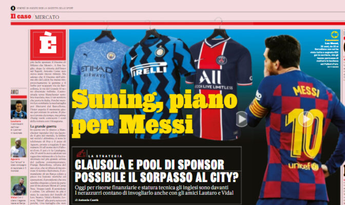 Gazzetta dello Sport: “Suning, piano per Messi. Clausola e pool di sponsor. Possibile sorpasso al City?”