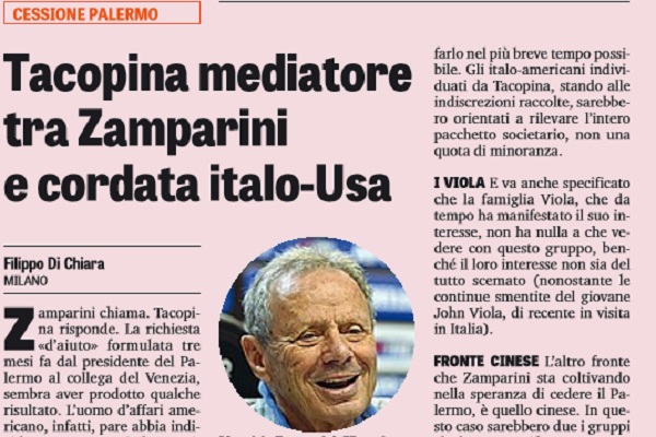 “Zamparini chiama. Tacopina risponde. La richiesta «d’aiuto» formulata tre mesi fa dal presidente del Palermo al collega del Venezia, sembra aver prodotto qualche risultato. L’uomo d’affari americano, infatti, pare abbia individuato un gruppo italo-americano seriamente disposto a trattare l’acquisto del Palermo. Il condizionale è d’obbligo, considerate le implicazioni legate alla cessione di un club e le molteplici trattative (o presunte tali) di cui si è parlato negli ultimi mesi relativamente al club rosanero. Se Zamparini avrà trovato l’acquirente giusto è presto per dirlo, ma l’interesse c’è ed è concreto, come testimonia l’intensificarsi dei contatti tra le parti degli ultimi giorni. La base di partenza sulla quale si sta discutendo è superiore ai 30 milioni di euro. Qualora i primi approcci dovessero dare esiti confortanti, nelle prossime settimane la negoziazione potrebbe subire una decisa accelerata. Se il mercato del Palermo appare fermo, probabilmente è anche per questo motivo. Zamparini vuole vendere e spera di farlo nel più breve tempo possibile. Gli italoamericani individuati da Tacopina, stando alle indiscrezioni raccolte, sarebbero orientati a rilevare l’intero pacchetto societario, non una quota di minoranza. I VIOLA E va anche specificato che la famiglia Viola, che da tempo ha manifestato il suo interesse, non ha nulla a che vedere con questo gruppo, benché il loro interesse non sia del tutto scemato (nonostante le continue smentite del giovane John Viola, di recente in visita in Italia). FRONTE CINESE L’altro fronte che Zamparini sta coltivando nella speranza di cedere il Palermo, è quello cinese. In questo caso sarebbero due i gruppi che hanno manifestato un certo interesse, ma l’input dato agli imprenditori locali dal governo di Pechino è quello di scalare società calcistiche europee di medioalto livello, indicazione che potrebbe rappresentare un problema, considerato che il Palermo non è un club di grandissime tradizioni. In tal senso, il presidente rosanero aspetta una risposta entro i primi giorni della prossima settimana”. Questo quanto si legge sull’edizione odierna de “La Gazzetta dello Sport”.