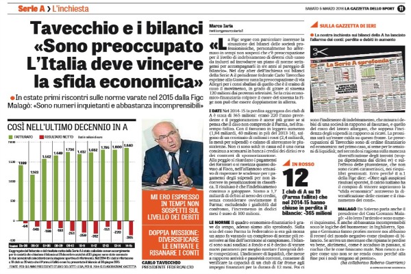 Gazzetta dello Sport: “Tavecchio e i bilanci: «Sono preoccupato L’Italia deve vincere la sfida economica. Troppi club indebitati, ecco le nuove norme…»”