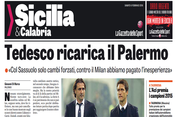 Gazzetta dello Sport: “Tedesco ricarica il Palermo: «Col Sassuolo solo cambi forzati, contro il Milan abbiamo pagato l’inesperienza»”